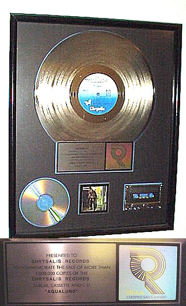 One of my favourite prized collectable items is this Platinum award,Presented to Chrysalis for the sale of more than 1,000,000 Lp's,CD's & cassettes of AQUALUNG. |